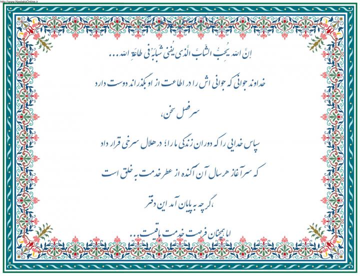 رسول اکرم صلی الله علیه و آله :إنَّ اللّه یُحِبُّ الشّابَّ الَّذی یُفنی شَبابَهُ فی طاعَةِ اللّه …